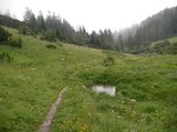 A mixture between sleet and snow had been falling for a while, but none of it stuck to the ground. After I got below the treeline, sleet and snow changed to rain, and the trail changed away from the rocky paths I had grown to loathe that morning already, and turned into a muddy contraption I'd grow to loathe even more. Progress was slow at times, because it was very slippery - treacherously so in fact.